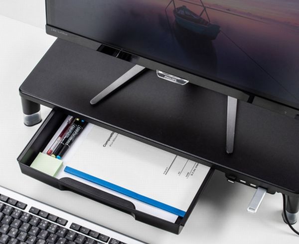 本製品は、デスク上の液晶ディスプレイやノートパソコンを上に載せることで、ディスプレイ下に新たな収納スペースを生み出す机上ラック。