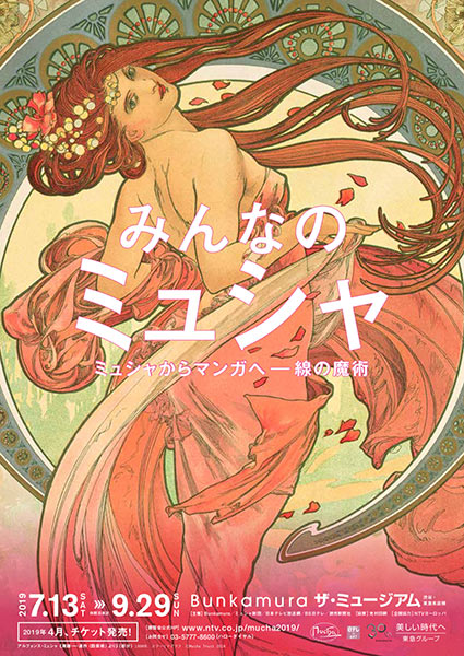 2019年7月13日(土)から9月29日(日)まで、Bunkamura ザ・ミュージアムにて「みんなのミュシャ ミュシャからマンガへ――線の魔術」が開催される。アール・ヌーヴォーを代表する芸術家のアルフォンス・ミュシャ(1860~1939)に注目した展覧会。彼が手掛けたポスターなどの代表作をはじめ、彼の作品に強い影響を受けた明治期の文芸誌の挿絵、グラフィック・アート作品、さらに日本の漫画家やアーティストの作品なども含む250点以上で構成されている。