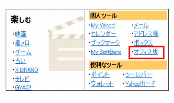 利用方法は簡単で、Yahoo! JAPANのサービス一覧を表示し、ページ右下の「個人ツール」にある、[オフィス版]をクリックすればYahoo! JAPANが「オフィス版Yahoo! JAPAN」に変更された。