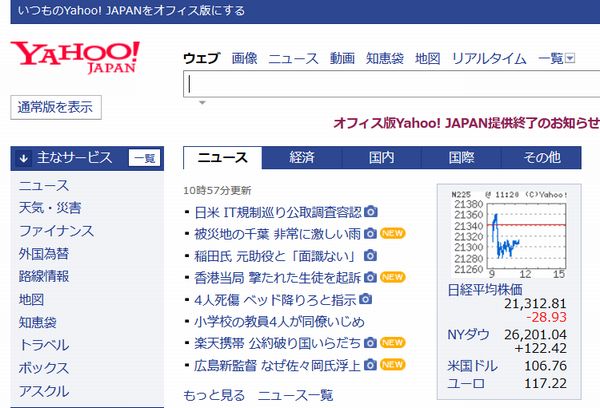 Yahoo!JAPANは、職場での利用に適したデザインで運用されていた「オフィス版Yahoo! JAPAN」を10月末をめどに終了すると発表した。