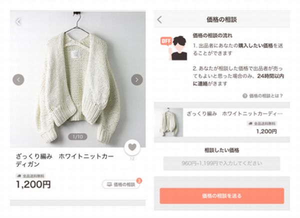 本アプリでは、価格交渉の機能化を実現。商品の詳細ページに「価格の相談」ボタンを搭載。購入者はそこから値下げ希望の価格の入力が可能だ。出品者はその価格に応じたくなければ無視し、希望価格に応じる場合のみ同意ボタンをタップすれば取引成立となるので煩わしい交渉から開放される。
