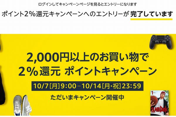 Amazonは、10月7日9時~10月14日23時59分の日程で「2,000円以上のお買い物で2%還元ポイントキャンペーン」を開催している。