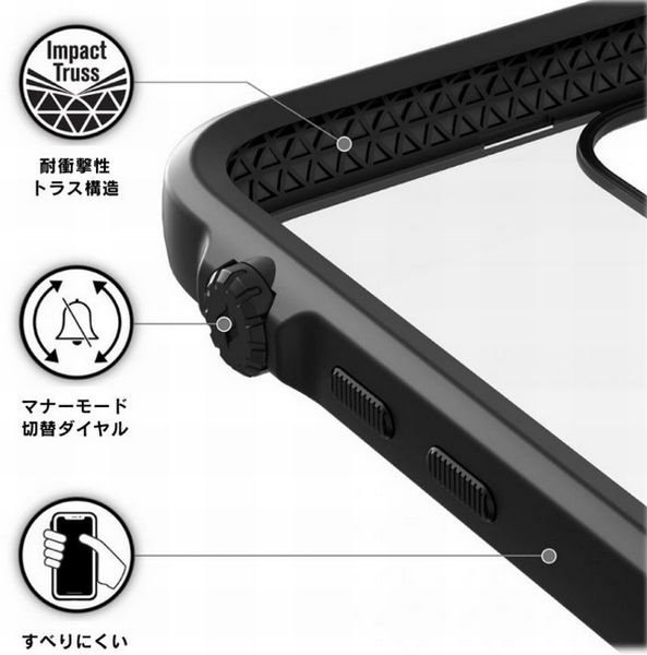 ケース内部には耐衝撃トラスクッションシステムを搭載。素材はゴムポリマーを使用し、2層のレイヤー構造の組み合わせによる耐衝撃性を高めている。高い耐衝撃性はアメリカ国防総省 軍事規格「MIL-STD-810G」に準拠する。
