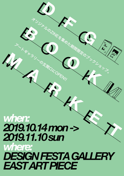 2019年10月14日(月・祝)から11月10日(日)まで、デザインフェスタギャラリー原宿にて「DFG BOOK MARKET」が開催される。アーティストによるオリジナルZINEが集まり、EAST館の玄関口の展示スペース「EAST ART PIECE」に並べられて、“期間限定の本屋さん”としてオープン。一般参加型の公募企画展で、70名を超える参加者が出品している。時間は11:00〜20:00。