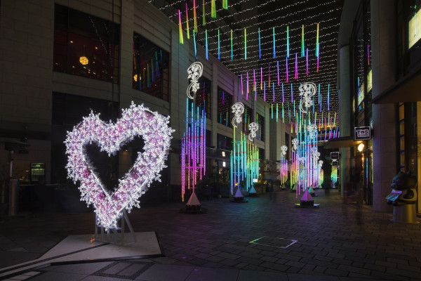 また、イベントタイトルに「音×サカス」とあるように、今年も音楽による演出も展開。クリスマスやバレンタインの季節にマッチした馴染みのある音楽に合わせ、イルミネーションの輝く光が踊りだす。この音と光の演出は、毎回10〜15分。17:00の回から21:00の回まで、30分刻みの間隔で1日9回実施される。