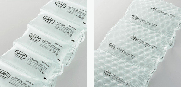 専用フィルムを使用して、必要な分だけ空気を入れて膨らませて作成。専用フィルムには、長方形に空気が入るピロータイプと、泡のように複数の空気が入るバブルタイプの2種類がある。フィルムにはミシン目が付いているため、梱包の隙間や包装物に合わせて手でちぎって使うことが可能。使用後には空気を抜けば小さくなるため、処分も簡単に行える。