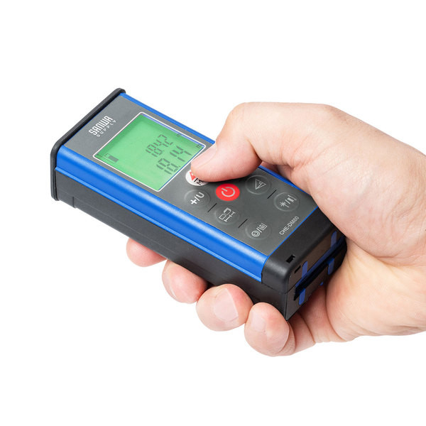 本製品では、0.05〜80mの距離を簡単に測定できる。使用時には赤色レーザー光が射出されるため、測定する場所を一目で確認することが可能だ。ピタゴラス測定機能により、建物の高さや幅の測定にも対応。そのほか、面積測定、体積測定、辺測定も行える。