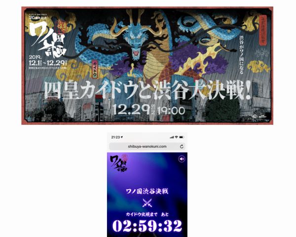2019年12月1日(日)~29日(日)、渋谷エリアにて、TVアニメ『ワンピース』20周年記念のイベント『渋谷「ワノ国」計画~仲間を集めて四皇カイドウと渋谷大決戦!~』が開催される。