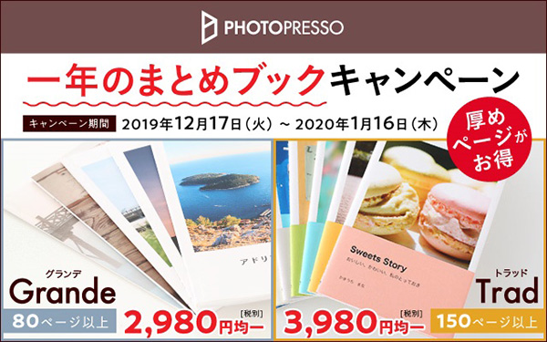 キヤノンマーケティングジャパン株式会社のフォトブックサービス「PHOTOPRESSO」は、「1年のまとめブックキャンペーン」を実施中。2020年1月16日(木)の23:59までの期間限定の注文で、TradとGrandeの両タイプが手頃な価格で提供されている。対象とされているのは、Tradタイプで150〜204ページ、Grandeタイプで80〜100ページ。“1年のまとめ”のキャンペーンのタイトルにふさわしく、ページ数が多いフォトブックをお得に作成できる。