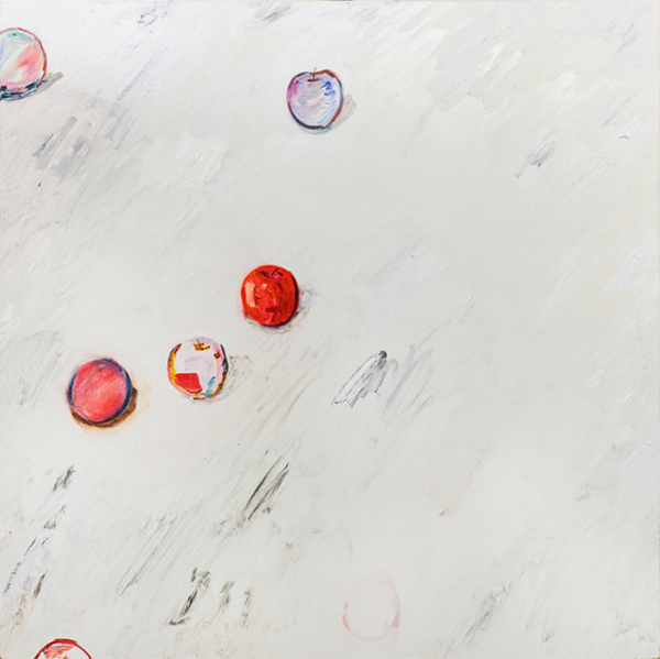 小津航氏は、東洋的な絵画空間を再考しながら絵画とモチーフの関係を模索して、アトリエの床に置かれたリンゴを油彩で表現。表良樹氏は、日用品の容器の中にさまざまな色彩の樹脂を流し込み、何層にも積層させた樹脂の塊を落下させて破壊することで、色鮮やかな断面を露わにし、その破片を空間に配置した作品を制作している。増田将大氏は、撮影した風景の画層を同じ場所に投影し、それをまた撮影するという行為を繰り返すことで生まれたイメージを、シルクスクリーンでキャンバスに刷り重ねて作品を制作しているアーティストだ。