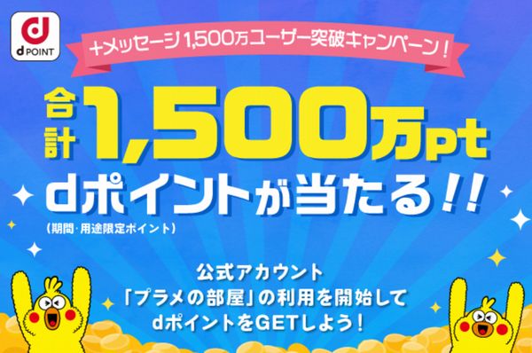 NTTドコモ・KDDI・ソフトバンクの携帯大手3社が提供する、SMS・メッセージングアプリサービス「+メッセージ」は、ユーザー数が1500万人を突破したことを記念してキャンペーンを開催している。応募期間は2月4日(火)11:00~3月8日(日)23:59。