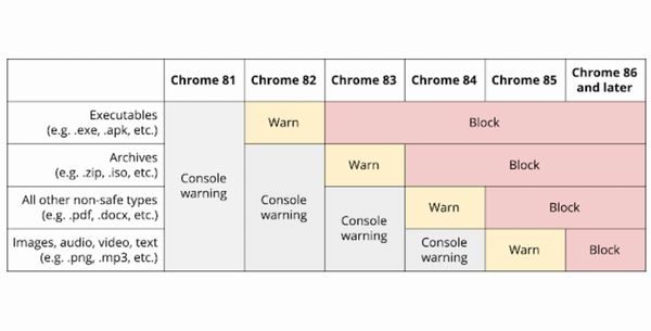 まずは2020年3月リリース予定の「Chrome 81」でダウンロードに際して警告が表示されるようになる。そして4月の「Chrome 82」からは混在コンテンツのダウンロードブロックが段階的に開始される予定だ。