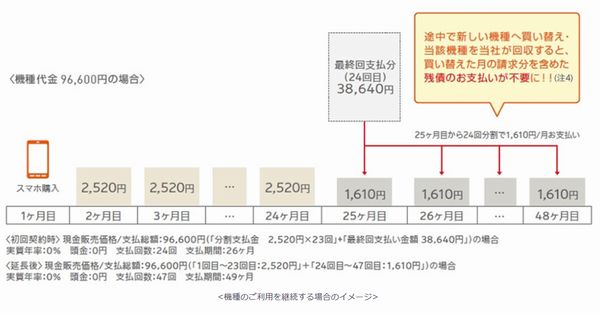 また、機種を継続利用する場合にも利用することができ、25カ月目以降も引き続き同じスマホを利用する場合、最終回支払分をさらに24回に再分割もできる。