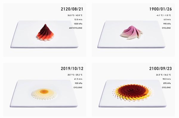 四季の移ろいなどを繊細に表現する和菓子の世界、それをデジタルで表現する。成形は風速・気圧・気温などその日の気象データを元にして、毎日形や色が変わる和菓子として提供される。