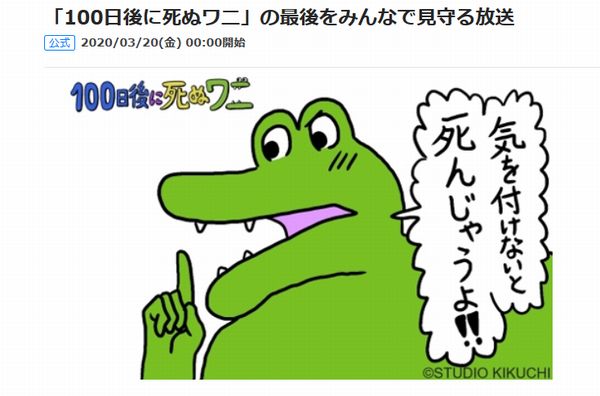 ニコニコ動画では、Twitterなどで話題になっている漫画「100日後に死ぬワニ」の100日目の投稿をみんなで見届ける『「100日後に死ぬワニ」の最後をみんなで見守る放送』を3月20日0時スタートで実施する。