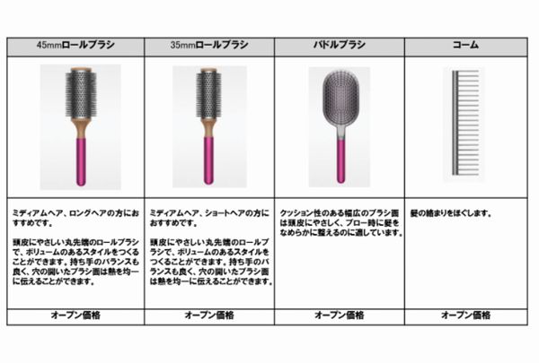 今回の4モデルの内訳は、ショートやロングヘアなどでボリュームのあるスタイルをつくり、熱を均一に伝えられるよう設計されたロールブラシが2種類(45mm/35mm)。頭皮にやさしくブロー時に髪をなめらかに整える幅広のパドルブラシが1種類。髪の絡まりをほぐしてくれるコームが1種類となっている。