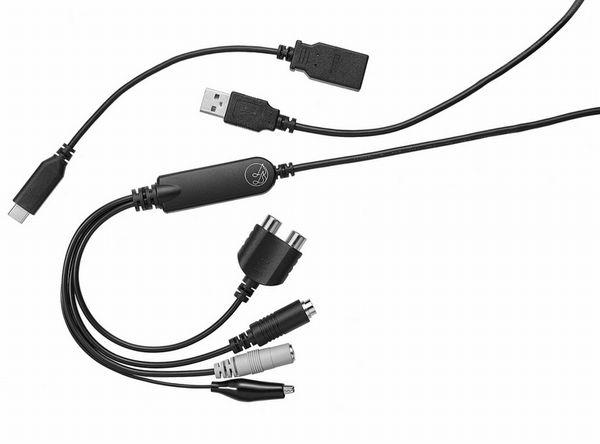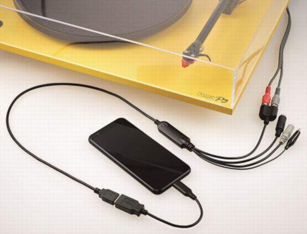 本体はケーブル状のアイテムで、レコードプレーヤーなどとはライン入力端子で接続し、スマホなどとはUSB-A・USB Type-C変換アダプターを使って接続する(iPhoneへの接続は別売りのLightning-USB 3カメラアダプターが必要)。