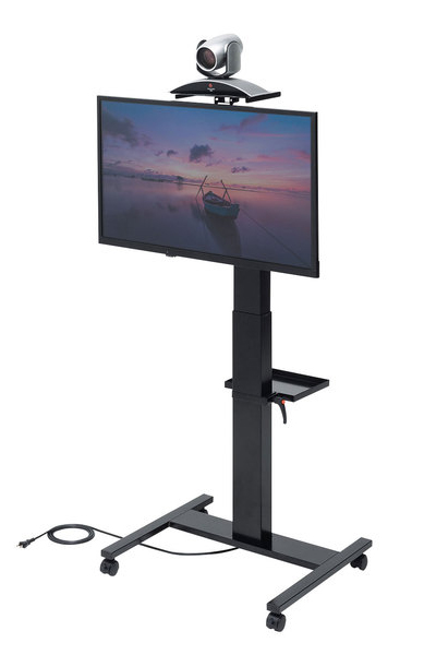 棚板やディスプレイ上部に設置できるカメラ台が標準で付属しており、Webカメラを設置することでWeb会議での活用にも便利。また、本体は簡単に移動させるためのキャスター付きで、前方のキャスターには不意に動き出すことを防ぐストッパーが付いている。本体サイズは600(幅)×966〜1,965(高さ)×500(奥行)mmで、重量は約15.8kg。100×100、200×100、200×200mmのVESA規格に対応し、規格に適合したディスプレイを取り付けることができる。