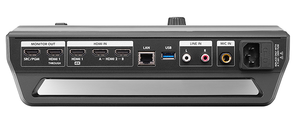 本製品はRTMP配信形式に対応しており、YouTubeやTwitchなどの各種の配信プラットフォームへの映像の送信が可能。SSL通信対応のRTMPS配信も可能で、Facebookライブなどのセキュリティが重視されている配信サービスにも対応する。入力端子はHDMI×3、ステレオRCA、6.5mmマイク端子。出力端子はHDMI×2、3.5mmステレオミニジャックで、フルHD対応のHDMI(SRC/PGM)に出力できる映像は2台までとなるため、HDMI1(4K)とHDMI2 A/Bのうち1つを選択して合成する。