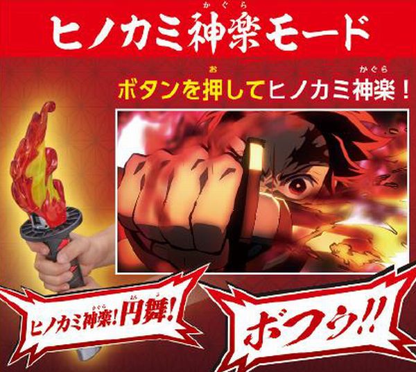 ヒノカミ神楽を取り付ければ「ヒノカミ神楽モード」になり、ボタンを押すと「ヒノカミ神楽!円舞!」などのセリフや「ボフゥ!!」といった効果音が流れる。