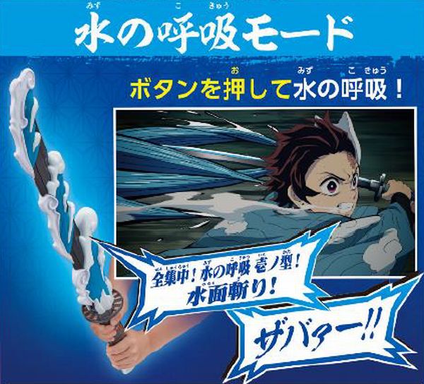 柄に水の呼吸を取り付ければ「水の呼吸モード」になり、ボタンを押せば「全集中!水の呼吸壱ノ型!水面斬り!」に始まり、拾の型までセリフと「ザバァー」などの効果音が流れる。