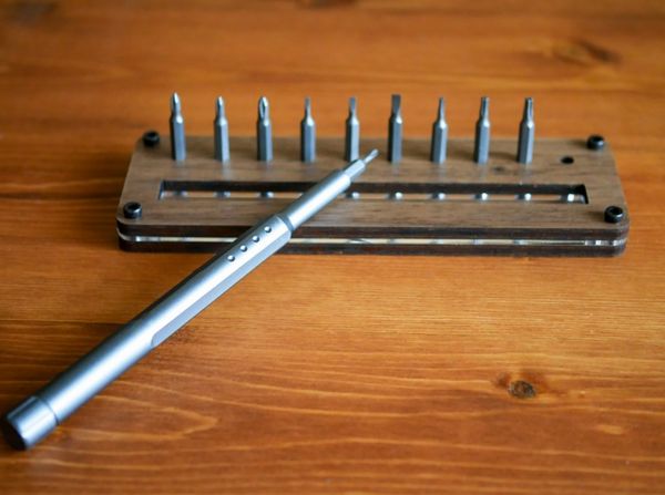 本製品は、ドライバーの交換用ビットを美しく収納することを目指した見せるデザインの精密工具。