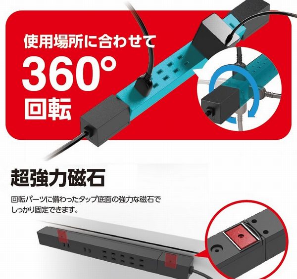 本製品は、差込口360°回転することで最適な設置方法が選べる多機能タップ。