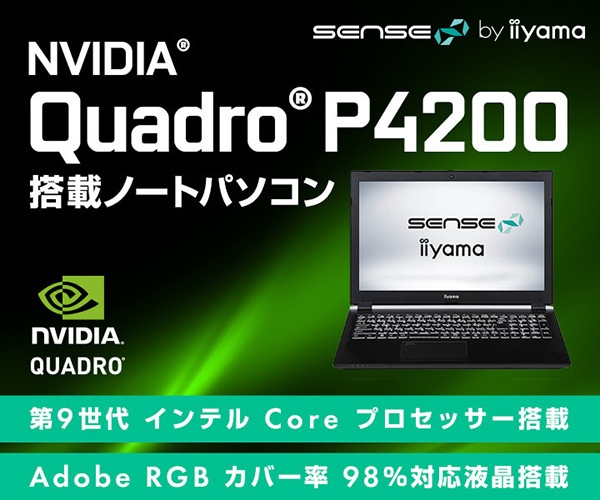 株式会社ユニットコムは、iiyama PCブランドの新製品として「NVIDIA Quadro P4200 搭載クリエイター向けノートパソコン」を発売した。クリエイター向けのシリーズ「SENSE∞」に属する製品で、BTOによる各種カスタマイズにも対応。本体に搭載された非光沢タイプの15.6型カラー液晶は、4K UHD(3,840×2,160)解像度に対応しており、Adobe RGBカバー率98%の色域が実現されている。