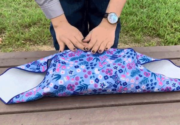 生地の素材は、表生地にマイクロファイバー、裏生地に極細のパイル地を採用。生地を重ねると摩擦により貼り付くので結ぶ手間が省ける。
