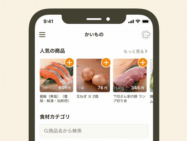 また、「かいもの」タブでは、検索を使ったりカテゴリーの中から欲しい食材を探して注文もできる。