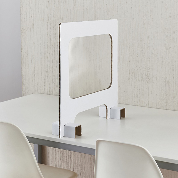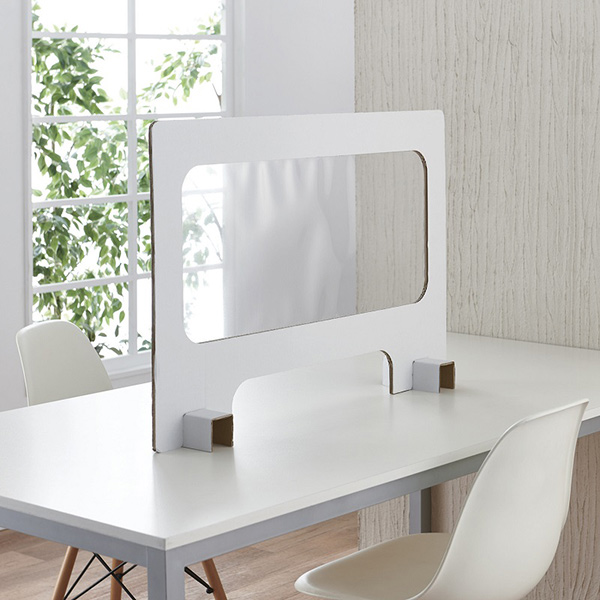 両製品は、気軽に導入でき、一時的な利用や短期間の設置にも便利なパーティション。パネルには厚さ0.3mmのPETシートによる透明な窓が付いており、設置したときの圧迫感を減らす効果とともに、円滑なコミュニケーションを実現できる。パネルの下部に約350(幅)×100(高さ)mmの荷物穴が設けられていることも特徴。この部分から、小さな荷物や書類の受け渡しを行える。組み立ての作業も難しくはなく、立体的な脚パーツにパネルを取り付けるだけ。パネルパーツは厚さ5mmの段ボールを2枚重ねることで強度を高めている。