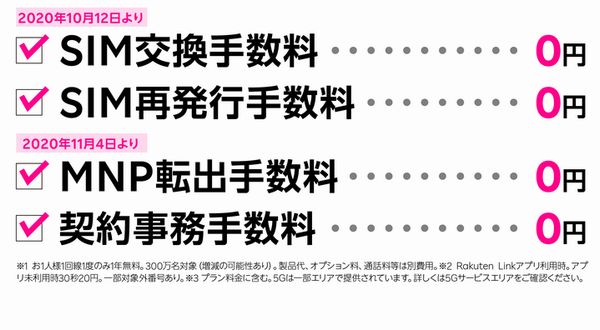 すでに10月12日からは「SIM交換手数料」「SIM再発行手数料」が無料化されているが、11月4日からは楽天モバイルの「契約事務手数料」「他社への携帯電話番号ポータビリティ(MNP)転出手数料」が無料になる。