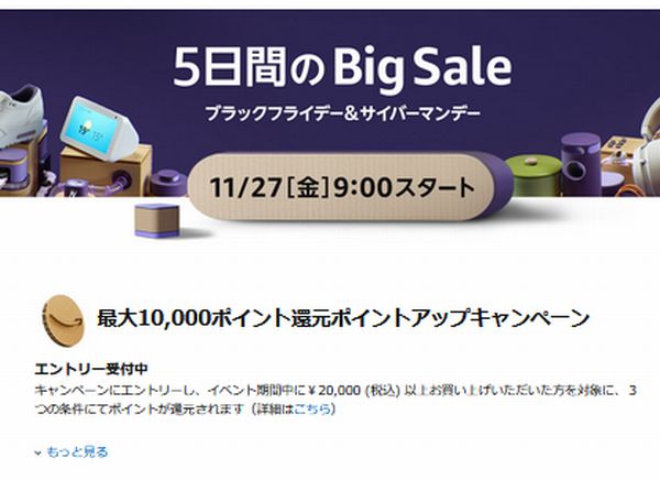 Amazonは、アメリカで行われる年末のビッグセール「ブラックフライデー」と「サイバーマンデー」について、日本では「ブラックフライデー&サイバーマンデー」として11月27日 (金)9:00 ~ 12月1日(火)23:59の5日間に渡って開催すると発表した。