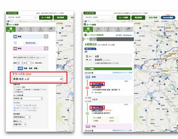 株式会社ナビタイムジャパンは、同社が運営する地図ポータルサイト「NAVITIME」(アプリ、スマホブラウザ、パソコン)と、乗換案内アプリ「乗換NAVITIME」にて、鉄道・バスのフリーパスを利用したルート検索に対応開始すると発表した。