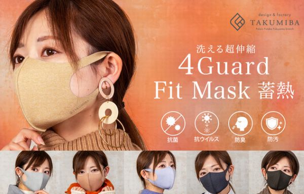 パレ・フタバ株式会社は、同社が運営するファブリックマスクブランド「TAKUMIBA(タクミバ)」のダイレクトストアにおいて、「洗える超伸縮4ガード蓄熱フィットマスク」を発売すると発表した。12月14日(月)17:00~16日(水)8:59までは会員先行販売、そして12月18日(金)17:00~からは一般販売する。価格は2枚組1,200円(税別)。