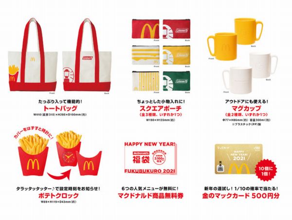 コールマン ジャパン株式会社と日本マクドナルド株式会社は、両社のコラボ企画として「マクドナルドの福袋2021」(税込3,000円)を販売すると発表した。