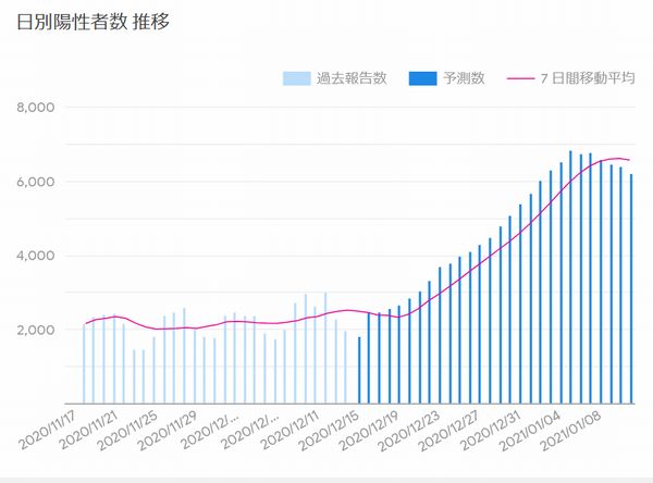 同サイトでは、12月31日の感染者数を全国5399人、1月1日に5676人と予測しており、非常に危機的な状況が続くことを示唆している。