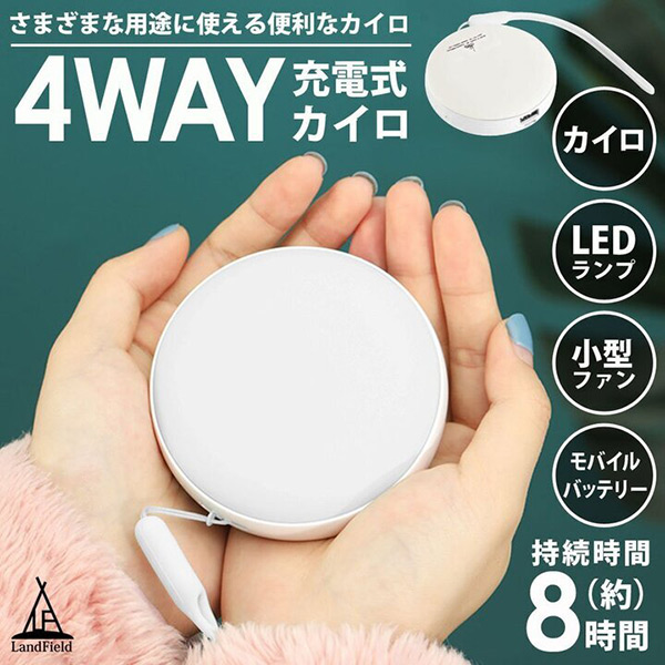 ランドフィールド、LEDランプや扇風機やモバイルバッテリーにもなる「4WAY 充電式カイロ」を発売