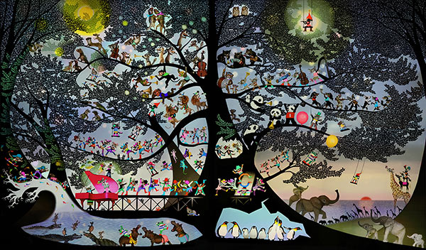 本展では、影絵作家の第一人者として名高い藤城清治氏の作品を紹介。藤城氏は「暮しの手帖」や朝日新聞などへの連載、TBS「影絵名作アルバム」などの仕事で広く知られ、キャラクター「ケロヨン」の生みの親でもある。カミソリと数百色のカラーフィルターを操り、愛らしいモチーフから聖書や童話の世界、緻密な風景画など、幅広いテーマで独特の世界を表現しつづけてきた。