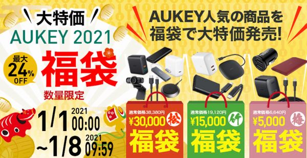 AUKEY(オーキー)は、2021年1月1日0時から1月8日9時59分まで、同社のイチオシ商品がセットになったお得な「中身の見える福袋」を販売すると発表した。