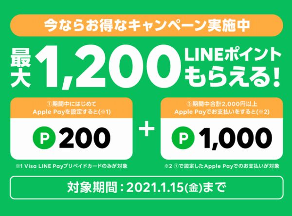 さらに、期間中に合計2,000円以上の「Apple Pay」で支払いを行うとLINEポイント1,000ポイントがプレゼントされる。