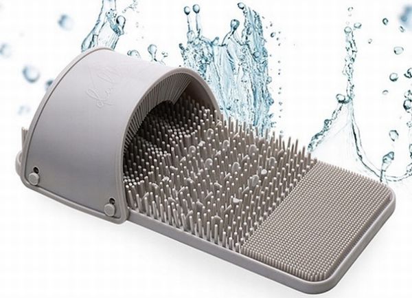 足を入れ、前後に動かすだけで指・足裏・かかと・甲を洗うことができ、かがむことが厳しい高齢者や妊婦さんにとって簡単に足を綺麗にできる。