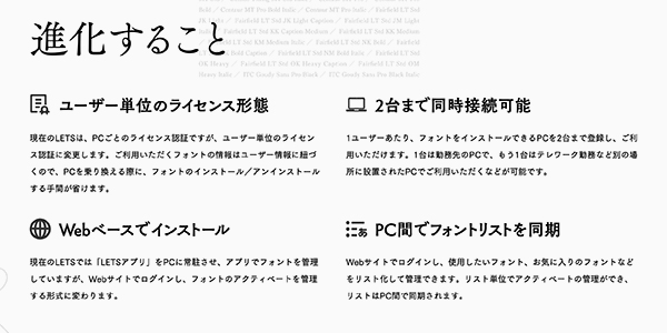 このように、各種の強化によって進化する「LETS」だが、これまでも強みであった根本的な使いやすさが損なわれることはない。オンラインで簡単な契約手続きを済ませれば、すぐにフォントをインストールして利用でき、許諾内容も明確に公開されているため、安心して幅広いコンテンツで活用することが可能だ。