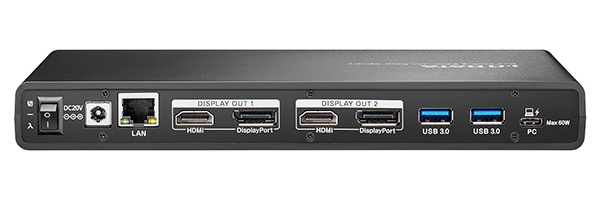 本製品は、USB 3.0(USB 3.2 Gen1)規格に対応。パソコン接続用の端子は、本体の背面に用意されている。USBハブ機能や有線LAN端子(10/100/1000BASE-T)など多彩な機能を利用でき、USBハブは本体前面にUSB A×2とUSB Type-C×2、本体背面にUSB A×2が配置された。1ポートあたり最大900mAの電力供給を行える(バスパワーで使用できる機器は最大2ポートまで)。