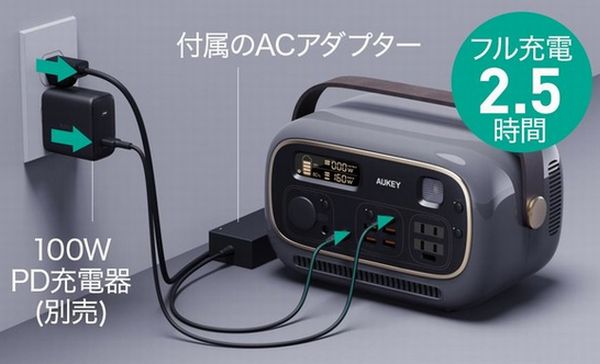 機能面では、60W DC入力と100WのUSB-C急速充電の同時使用で、最速2.5時間でフル充電できる。