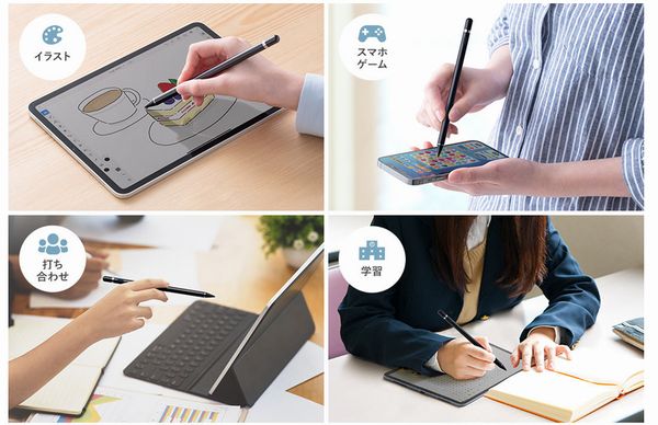 本製品は、スマートフォンやタブレット、ゲーム機のディスプレイでイラスト作成やゲーム操作、メモ書きなどができるタッチペン。