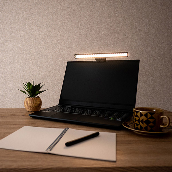 本製品は、約26cm幅のUSB給電式ライト。約5mmから10mmの幅をクリップで挟んで固定でき、一般的なノートパソコンなどに設置できる。コンパクトで場所を取らず、在宅ワークにおいて手元の作業スペースやリモート会議での自分の顔を明るく照らす用途に便利。切り欠けが入っているため、ノートパソコン上部に取り付ける際にもカメラの邪魔にはならない。