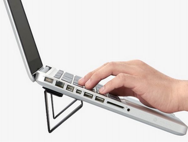 「ノートPCスタンド」はノートパソコンの背面に三角のスタンドと滑り止めパッドを貼り付けるだけの簡易スタンド。
