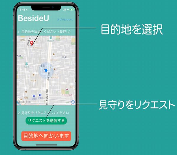 女性の夜道の一人歩きなどに安心をもたらす見守りアプリ「BesideU」
