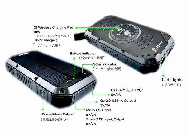 30000mAhの大容量で太陽光充電・無線充電・LEDライトなどを備えるバッテリー「FREEK3」